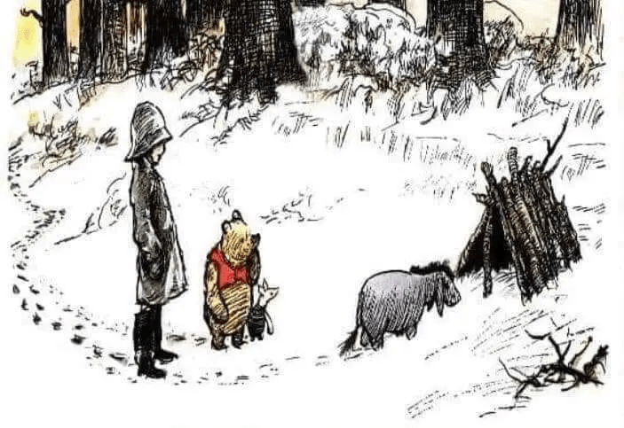 It occurred to Pooh and Piglet that they hadn’t heard from Eeyore for several days, so they put on their hats and coats and trotted across the Hundred Acre Wood to Eeyore’s stick house. Inside the house was Eeyore.